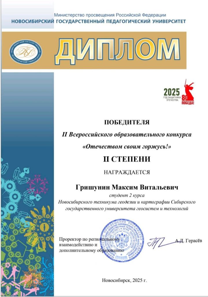 Студенты нашего техникума Китаев Артём и Гришунин Максим из группы ЗУ9–12 с преподавателем географии Шеремет Еленой Николаевной участвовали и победили во Всероссийском образовательном конкурсе «Отечеством своим горжусь!» который проходил с 17 до 22 ноября.