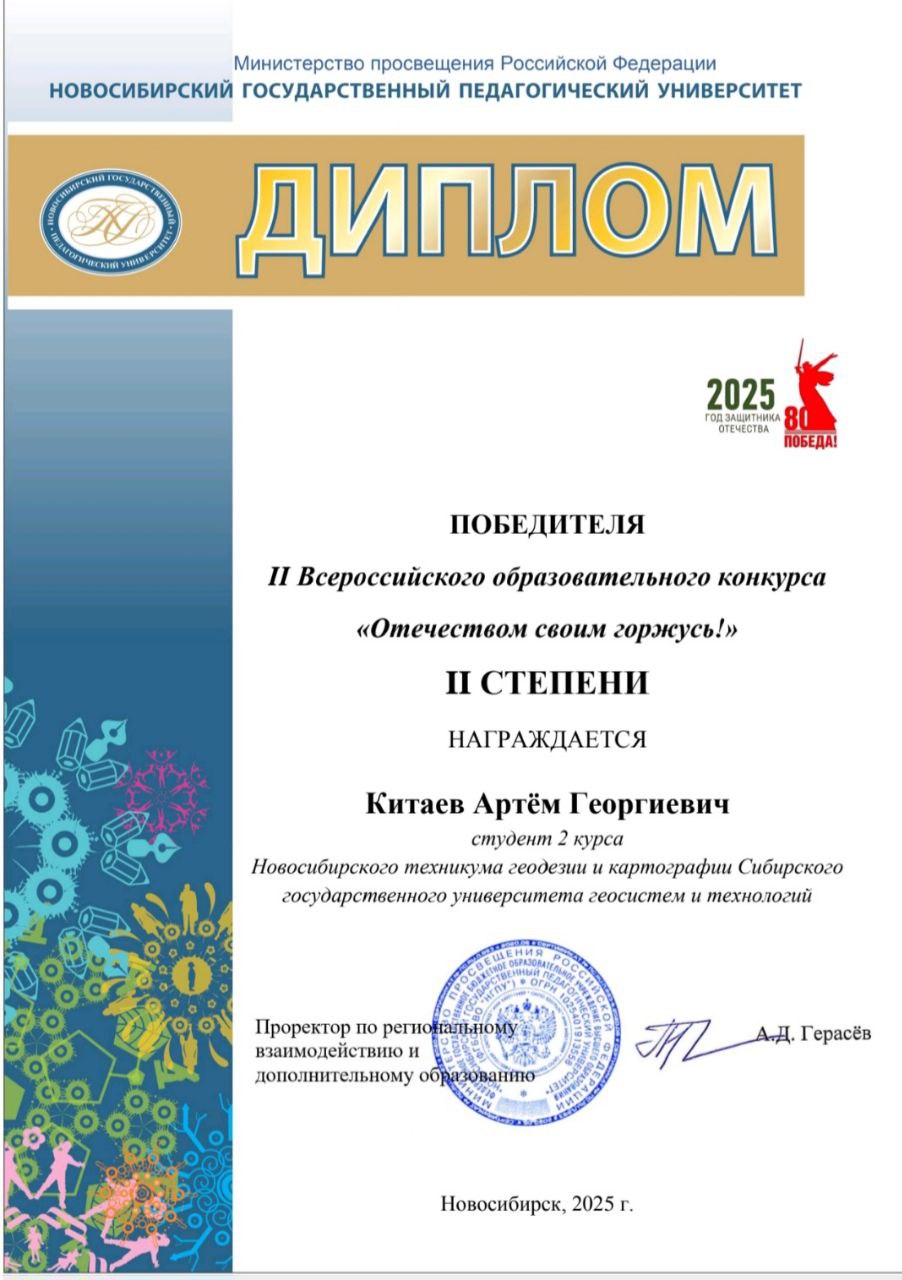 Студенты нашего техникума Китаев Артём и Гришунин Максим из группы ЗУ9–12 с преподавателем географии Шеремет Еленой Николаевной участвовали и победили во Всероссийском образовательном конкурсе «Отечеством своим горжусь!» который проходил с 17 до 22 ноября.