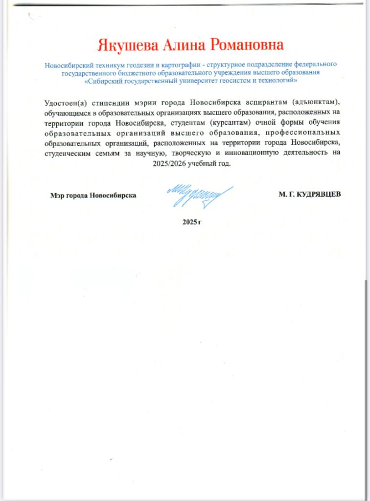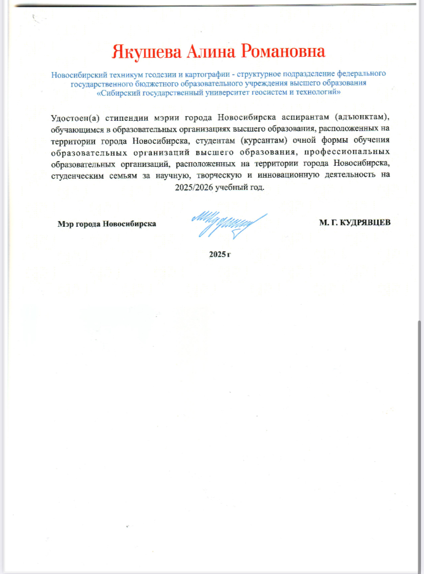 От НТГиК обладателем титула — стипендиат мэрии стала студентка группы ПГ9-24, Якушева Алина Романовна. Поздравляем Алину и желаем дальнейших успехов